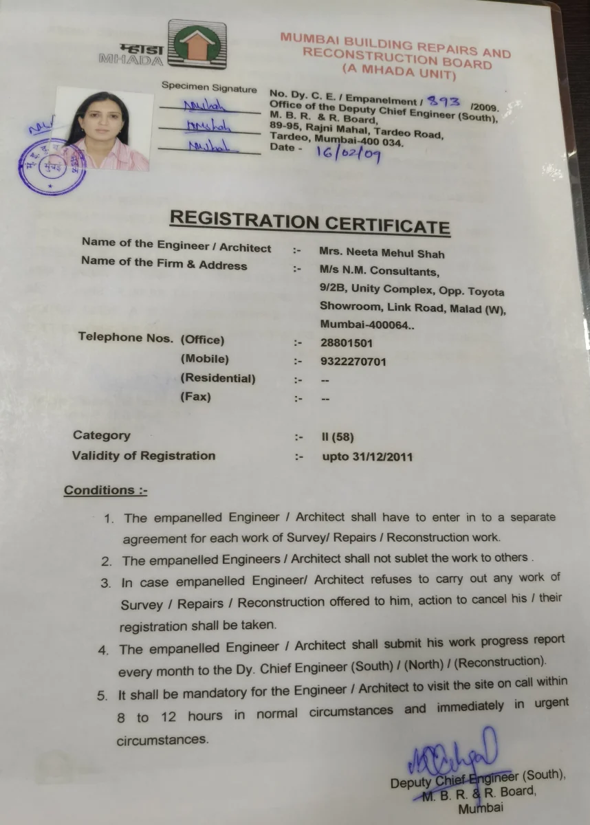 - Registered with MHADA (Maharashtra housing and development authority)